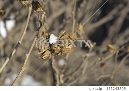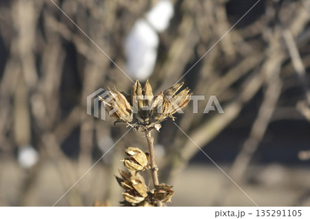 Close-up of dry buds of Syrian hibiscus in early spring against a blurred background