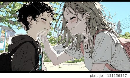 Schoolboy and schoolgirl are talking and standing on the stair.