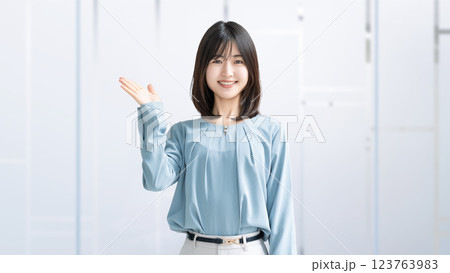 人差し指を立てて案内する笑顔の女性・ビジネスウーマン