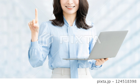 パソコンを持って手で案内をする女性・ビジネスウーマン