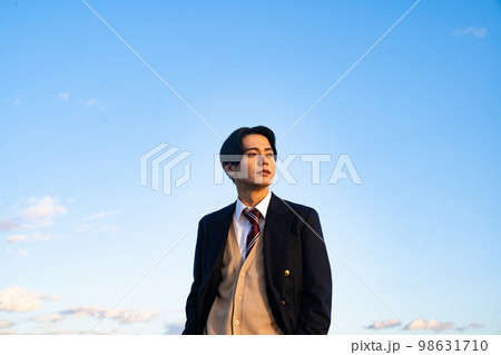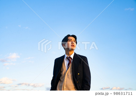 制服を着た男子高校生のポートレート 青空 空 屋外 河川敷 韓国人 カーディガン 学生服