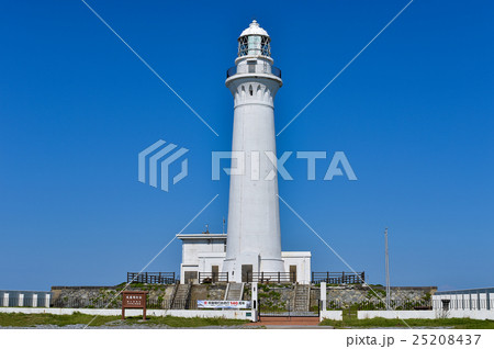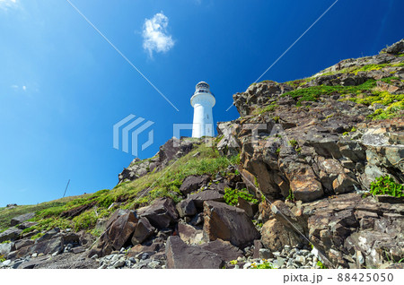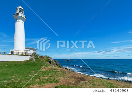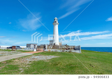 【青森県下北半島尻屋崎】津軽海峡と白亜の灯台と青空