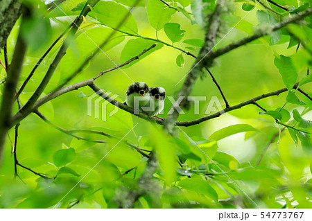 緑の葉に囲まれた枝にとまり前を見るシマエナガ