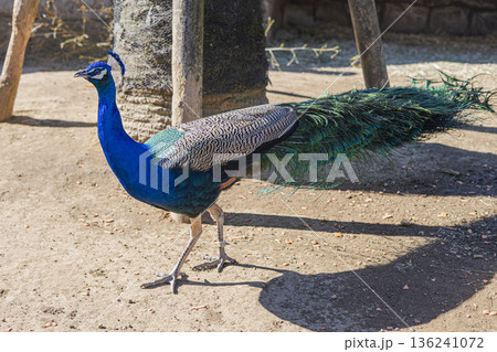 動物園の放し飼いの孔雀 クジャクの全身