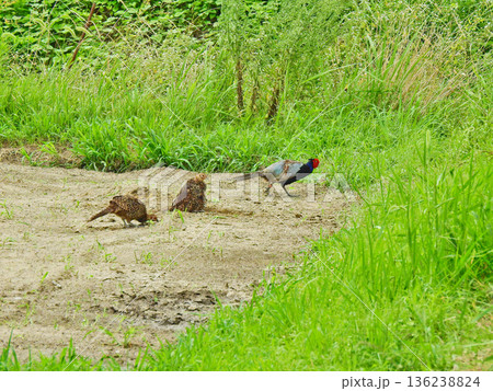 長い尾でカラフルな羽毛が美しい国鳥キジの家族