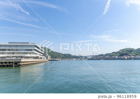 広島県尾道市 快晴の尾道市役所と尾道水道の様子