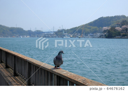 尾道駅前広場の柵に止まっている鳩