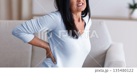 Portrait of sad mature woman having back pain while sitting on the couch at home, suffering from tension and acute spinal ache, feeling uncomfortable, stressed lady tired of work