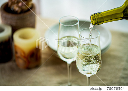 Two glasses of sparkling wine on dining table.