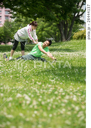 公園で準備運動・ウォーミングアップするスポーツウェアのアジア人男女