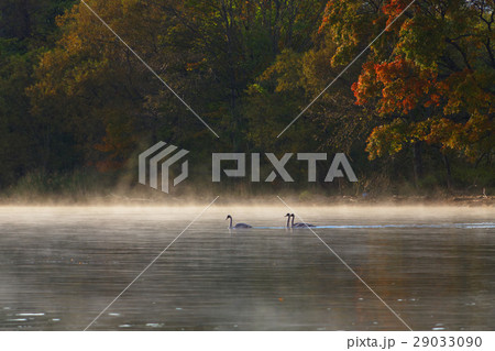 屈斜路湖の湖畔の紅葉と白鳥の群れ