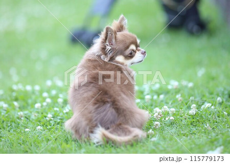 ドッグランで遊ぶかわいいチョコタンチワワ