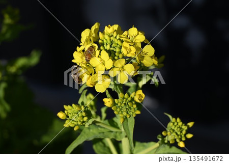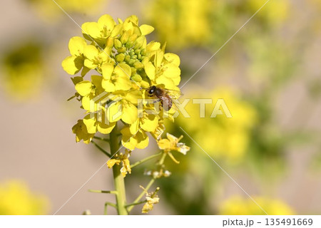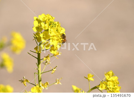 菜の花の花粉を集めに来た飛んでいるセイヨウミツバチ