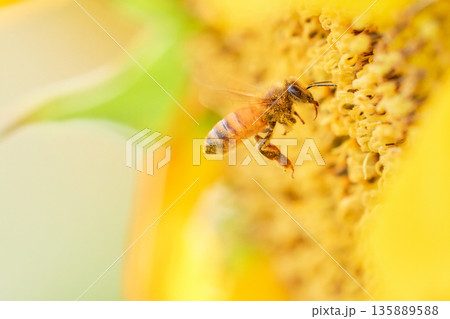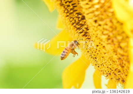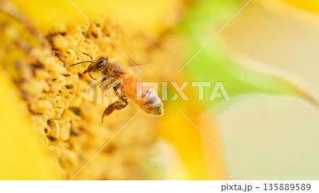 ヒマワリの花に飛んできた一匹のセイヨウミツバチのアップ
