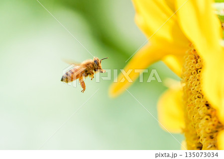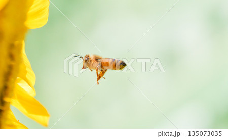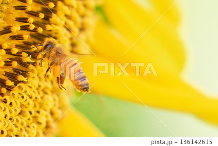 ヒマワリの花に飛んできた一匹のセイヨウミツバチのアップ