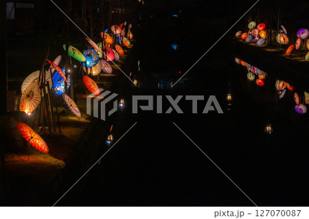 岡山県倉敷市の観光地の美観地区で夜のライトアップされた和傘 倉敷春宵あかり