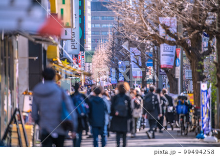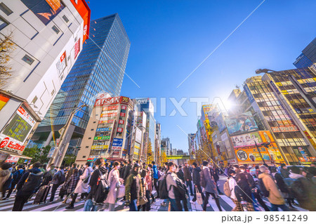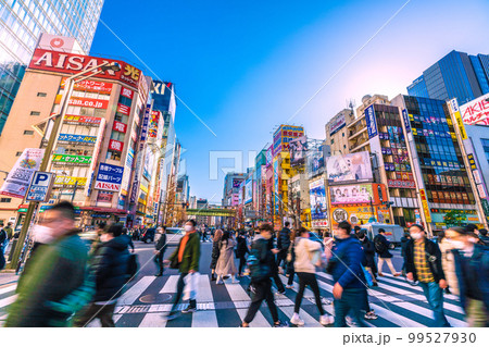 日本の東京都市景観 賑わう秋葉原。コロナ禍前のような人出。屋外等マスク不要=2月22日