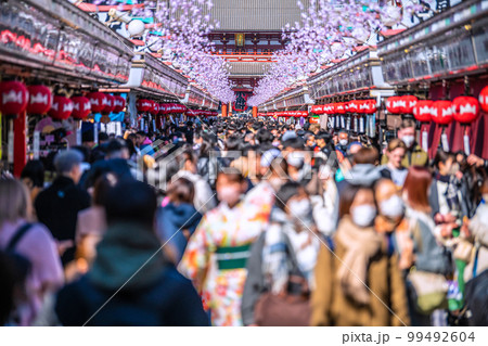 日本の東京都市景観 外国人観光客で賑わう浅草寺。コロナ禍前のような人出。屋外等マスク不要=2月22日