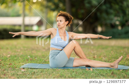 Yoga practice on embankment, female athlete fulfil carry out Anjaneyasana