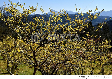 四阿屋山福寿草園地に咲くロウバイの花に武甲山