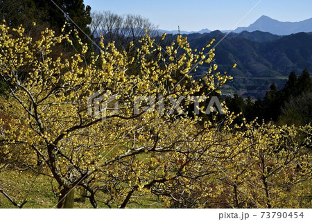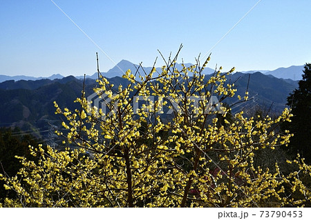 四阿屋山福寿草園地に咲くロウバイの花に武甲山