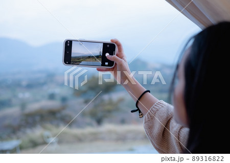 Woman using smartphone take a photo at Khao Kho, Thailand