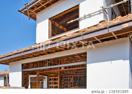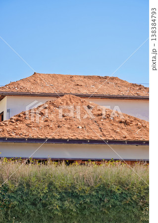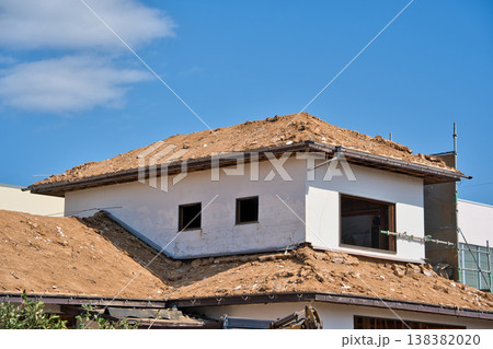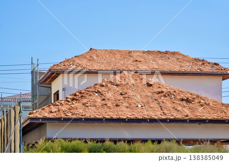 古い木造住宅の解体現場 土で葺いた屋根
