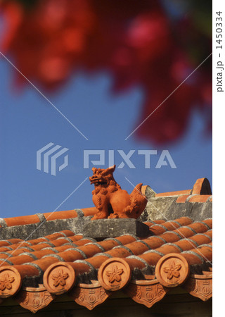 赤瓦屋根の上のシーサーとブーゲンビレア