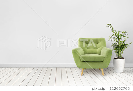 Empty living room wall mockup with green velvet armchair, and palm plant in pot