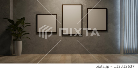 A modern loft industrial room features a houseplant, a parquet floor, and frames on a cement wall.