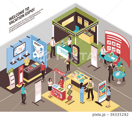 たくさんの来場者で溢れるビジネス展示会イベントのアイソメイラスト