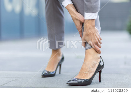 A close-up of a businesswoman outdoors, clutching her ankle due to pain caused by wearing high heels. Focus on the discomfort and professional attire.