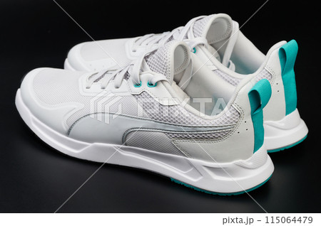 White sneaker with colored accents on blue background, Fashionable sport shoe with colorful backdrop. Studio shot of shoes for shop advertisement, creative minimalist style