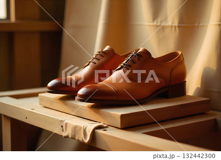 black leather shoes on a wooden desk