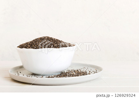 Chia seeds in bowl on colored background. Healthy Salvia hispanica in small bowl. Healthy superfood