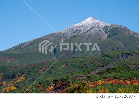 秋の晴れた日の森林地帯と冠雪の山頂 十勝岳