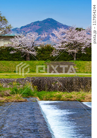 【京都風景】賀茂川より望む桜と山(比叡山/大文字山)