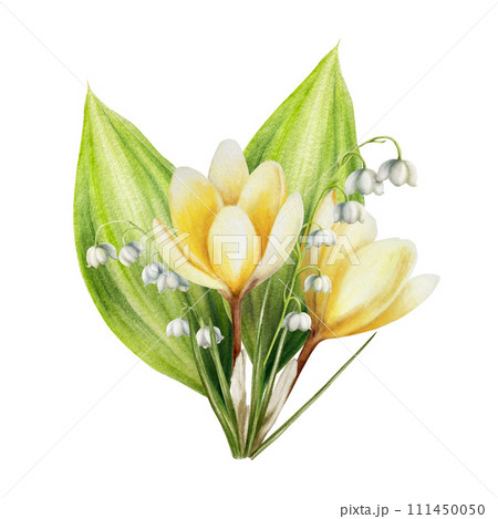 Watercolor bouquet of yellow and white blooming crocus and lily of the valley flowers isolated on white background. Spring and easter botanical hand painted saffron illustration. For designers,