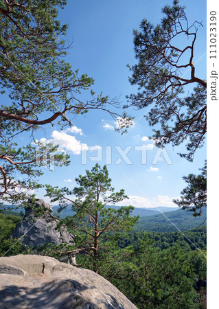 Big old pine tree growing on rocky mountain top under blue sky on summer mountain view background