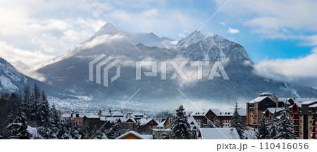 Cityscape of Brianson, ski resort in France. Mountain covered with snow and fog. Alpine landscape