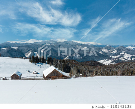 Winter landscape with spruse trees of snow covered forest in cold mountains.
