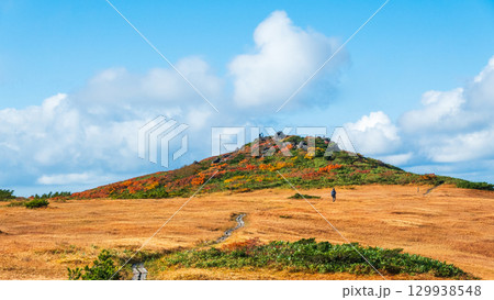 秋の栗駒山登山(栗駒山~秣岳:しろがね湿原から栗駒山の眺め)