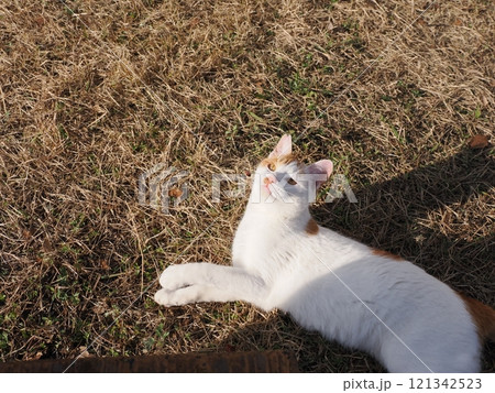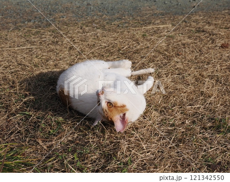 壊れたおもちゃ猫じゃらし遊びに夢中な可愛い白猫