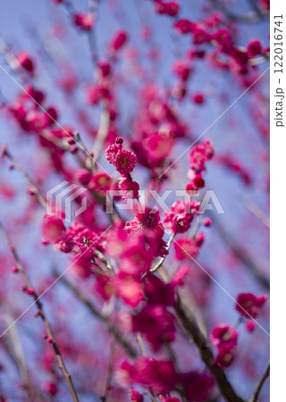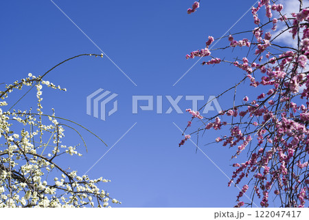青空の両端に白色の梅の花とピンク色の梅の花が咲いています。
