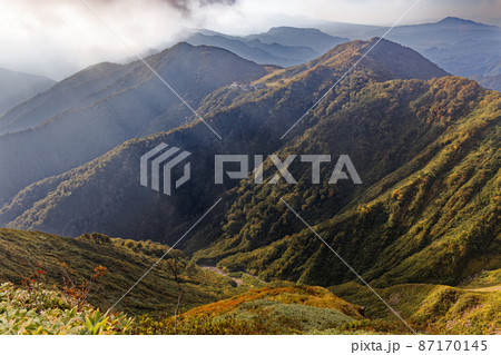 紅葉の谷川岳・西黒尾根の登りから見る朝日差さす山並み