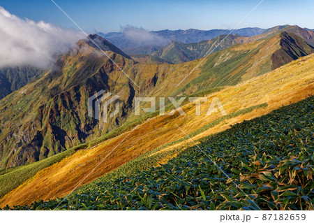 紅葉の谷川岳・西黒尾根の登りから見る朝日差さす山並み
