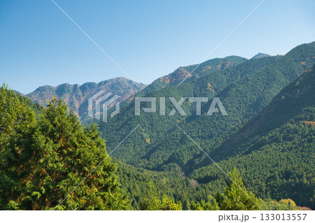 立里荒神社の参道のから見た大峯山系の山々と新緑2 奈良県吉野郡野迫川村