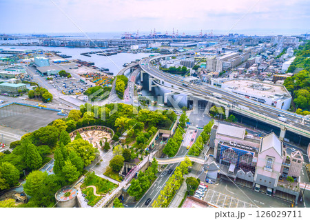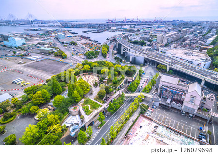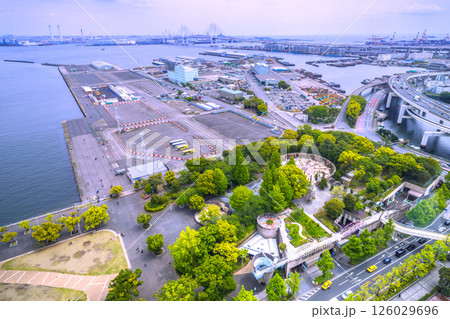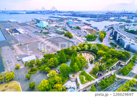 日本の横浜都市景観 ベイサイドブルーの山下ふ頭待合所などを望む