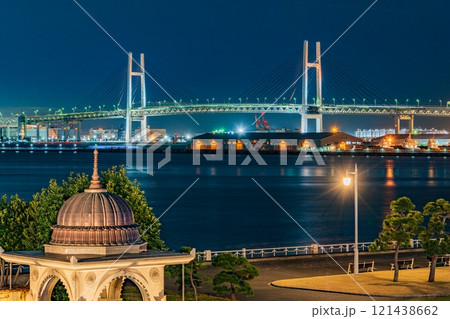 ライトアップされた山下公園とベイブリッジ
