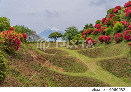 (静岡県)ツツジ咲く山中城址公園、後方に富士山